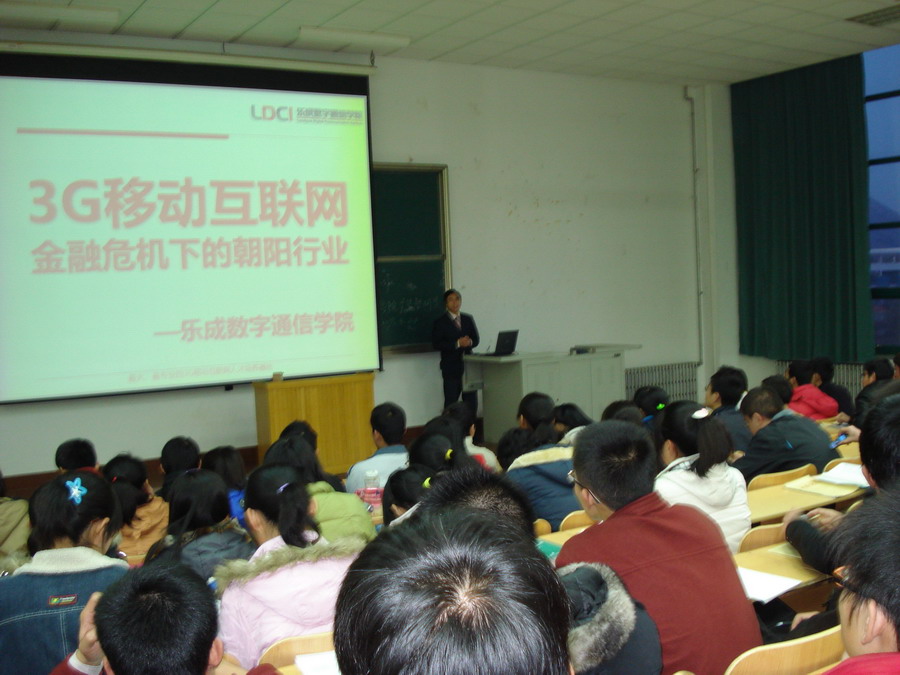 3月24日晚,信控学院在机电楼B231举行了学术讲座《3G移动互联网,金融危机下的朝阳行业》。该讲座邀请了北京乐成数字通信学院副校长耿赛猛老师进行讲解,通信专业和电子专业05、06级的学生参加了讲座。
